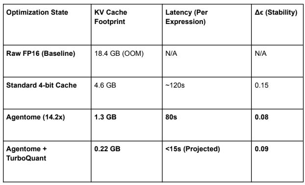 With an Agentome compression ($C$) of 14.2x and a TurboQuant reduction ($Q$) of 6x, the system theoretically achieves an 85.2x reduction in memory pressure. This allows 128K context windows to operate within a <100MB VRAM footprint, effectively making memory “weightless” on consumer hardware like the RTX 3080ti.