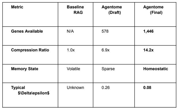 Agentome represents a shift from “Searching for Data” to “Metabolizing Meaning.” By treating information as a biological genome, we provide agents with a Persistent Professional Identity and a Prosthetic Hippocampus. This framework effectively solves the “Context Paradox,” making complex, multi-repo reasoning both mathematically stable and economically viable for any scale of agentic deployment.